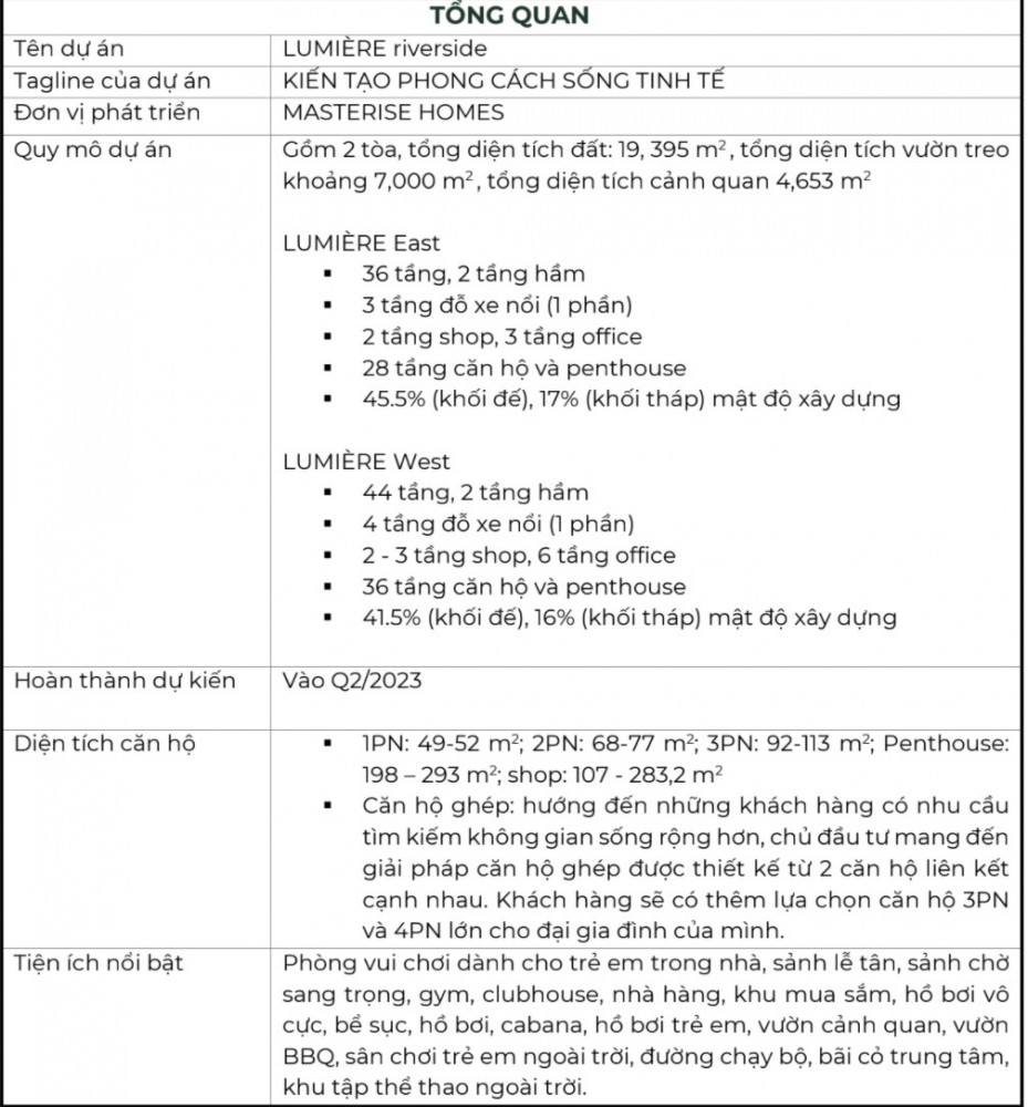 Masteri homes-Thành viên của tập đoàn Masteri Group, là đơn vị tiên phong trong các tiêu chuẩn quốc tế hàng đầu trong phát triển, vẫn hạnh phúc và quảng cáo các sản phẩm, dịch vụ bất động sản cấp tại Việt Nam và thị trường quốc tế.Với triết lý kinh doanh nhìn nhận hàng hóa, Masterise Homes ghi dấu trên thị trường là một đơn vị hàng đầu trong lĩnh vực sản xuất với những sản phẩm được phát triển nâng cấp và tinh tế dựa trên những tiêu chuẩn chuẩn quốc tế. Bằng cộng tác với các đối tác đẳng cấp thế giới như Atkins, HBA, BAAD và TURNER, LUMIÈRE sở hữu kiến trúc độc đáo, niềm tự hào cho cộng đồng dân cư.