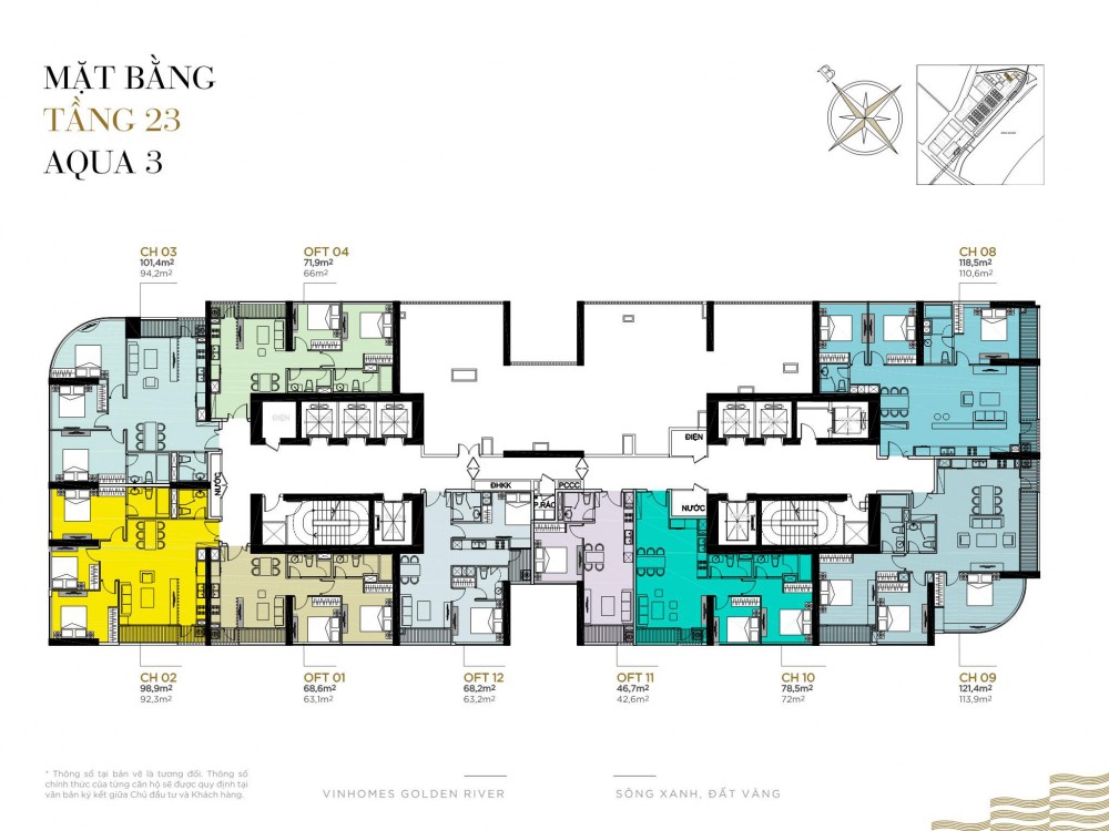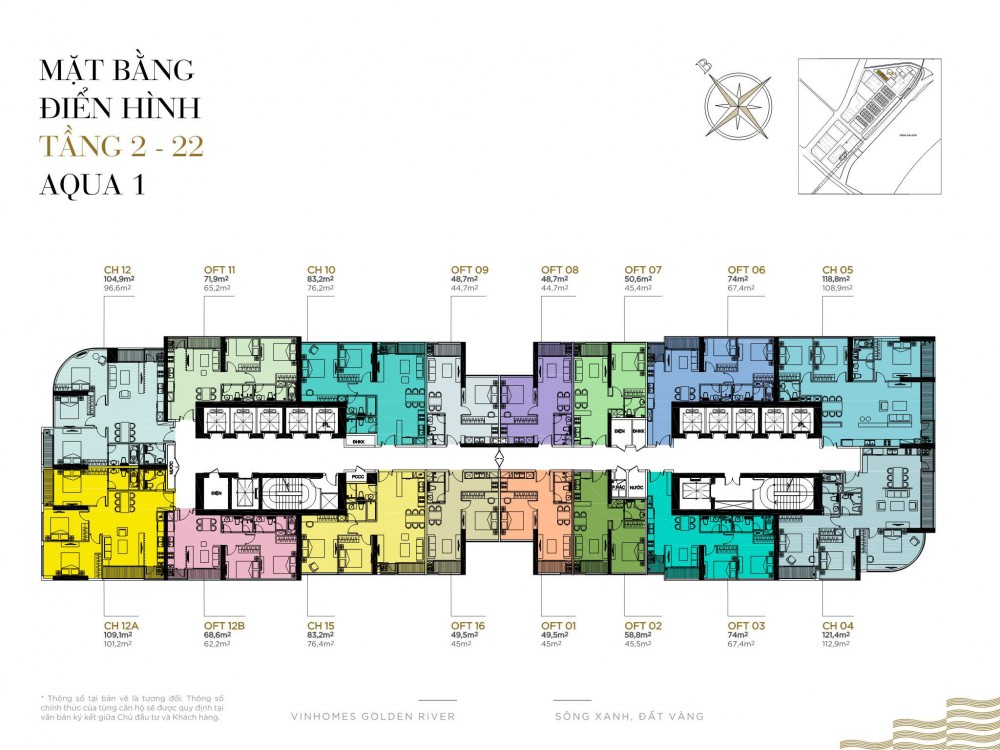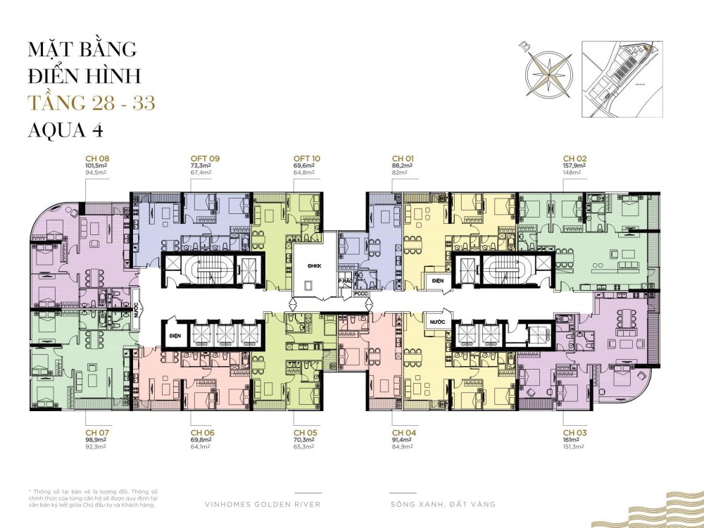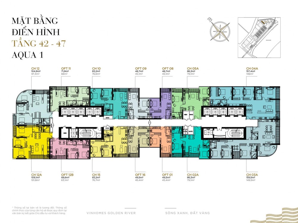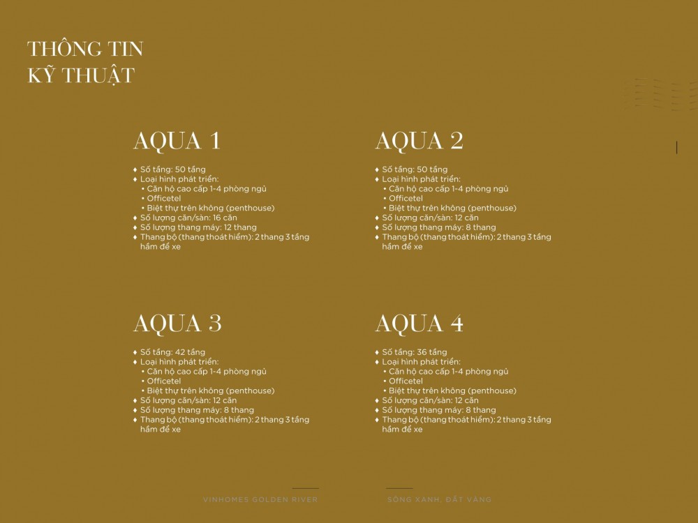 – Quy mô: Dự án căn hộ Vinhomes Golden River được quy hoạch và phát triển bao gồm 16 tòa tháp căn hộ, văn phòng, khách sạn và 63 căn biệt thự và được chia thành 4 phân khu chính.